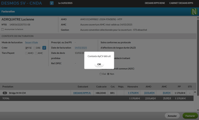 A la fin de la facturation un message indiquant que le contexte apcv est détruit s'affiche, cliquez sur OK.