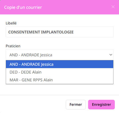 Une fenêtre s’ouvre : sélectionnez le praticien avec lesquel vous souhaitez partager ce modèle