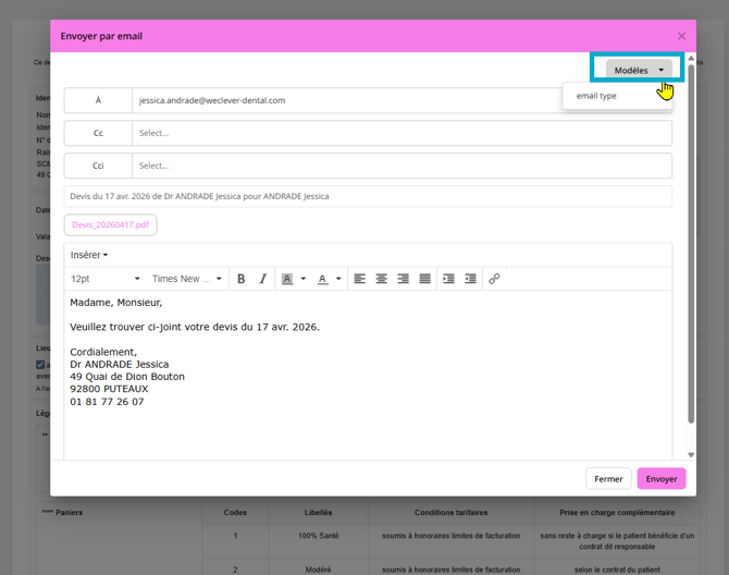 Les modèles d’email permettent de préparer à l’avance des messages réutilisables lors de l’envoi de documents comme des devis, des ordonnances, des courriers ou encore des factures.