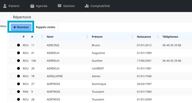 Créer la fiche patient manuellement en cliquant sur Nouveau