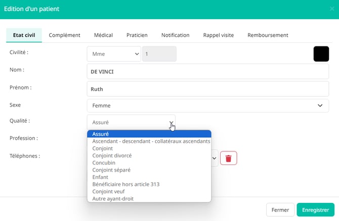Modifiez si nécessaire la Qualité du patient.