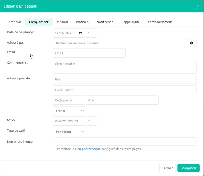 Saisir ensuite la date de naissance et le rang et le numéro de Sécurité Sociale, enregistrer les informations pour finaliser la création du dossier.