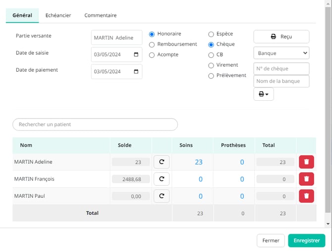 Lorsque vous effectuez un règlement pour l'un des membres de la famille créée, vous visualisez les soldes dues par tous les membres de la famille, vous pouvez ainsi valider un paiement groupé ( voir paiement groupé).