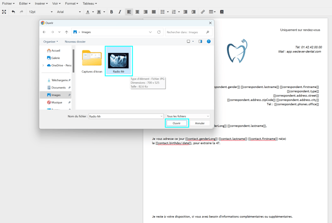 Cherchez et sélectionnez l'image à importer dans la nouvelle fenêtre, puis cliquez sur "Ouvrir", l'image s'implémente sur votre courrier.