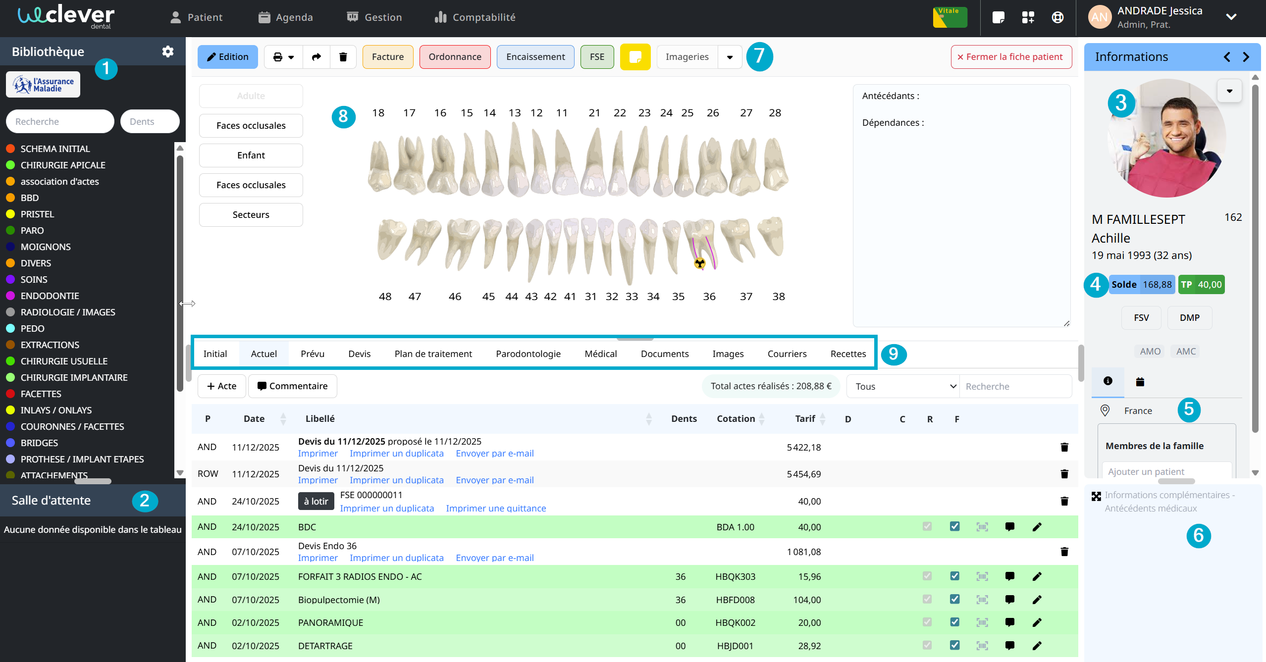 Bibliothèque d'actes : ici, vous trouverez votre liste d'actes fréquemment utilisés, personnalisable selon vos préférences. Cela facilite l'accès rapide aux procédures que vous effectuez régulièrement.