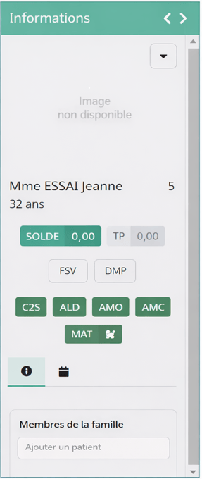 | AMC en Vert | Indique que le patient possède une complémentaire (mutuelle) renseignée et que le Tiers Payant est activé. | |