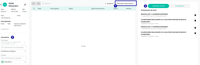 Les traitements de fond du patient sont affichés dans la fenêtre, en haut à droite. Ainsi que l'accès aux monographies (3)