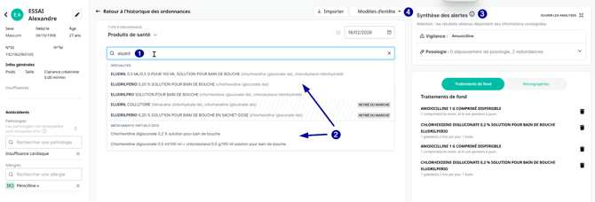 La synthèse des alertes de pharmacovigilance du patient s'affiche en haut à droite (3).