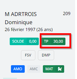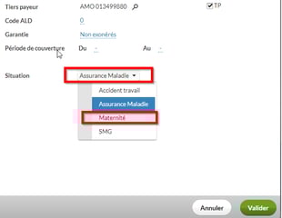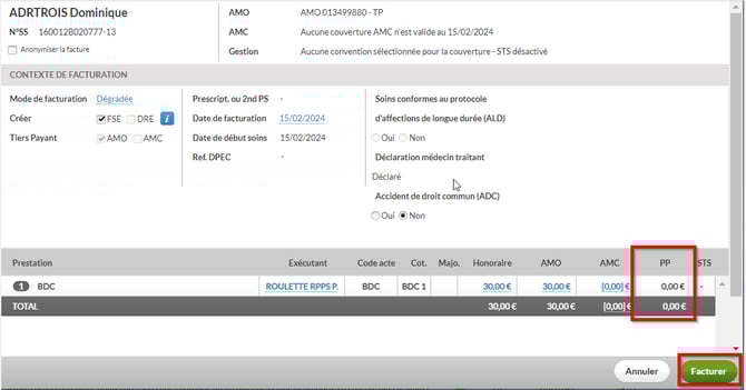 Vérifiez que la ligne de facturation affiche bien TP AMO (60%) + TP AMC (40%) ou TP AMO à 100% selon le cas de la patiente.