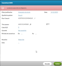 La suite est commune au cas N°1, une fois l'EBD coté, un message indique qu'il est pris en charge dans le cadre de la maternité.