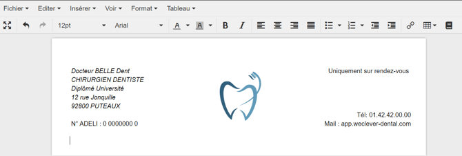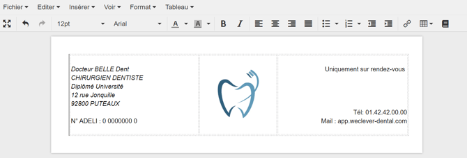 Dans l'exemple ci-dessous, nous allons utiliser un tableau de trois colonnes ce qui permettra de placer les informations du praticien à gauche, le logo au centre et l'adresse mail et n° de téléphone à droite.