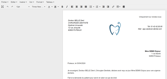 - Et voici le courrier, qui est une attestation de présence pour une urgence dentaire, lorsqu'il sera édité dans la fiche du patient. Reste à l'imprimer ou l'envoyer par mail :
