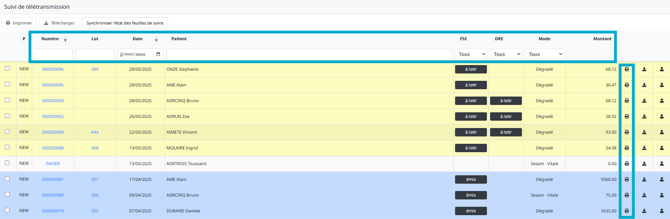 Cette fenêtre présente l’ensemble de l’historique des feuilles de soins électroniques transmises.