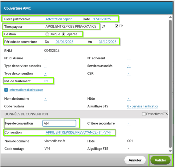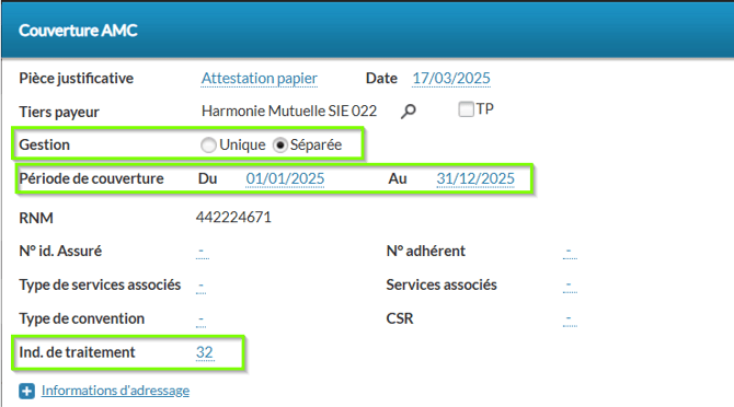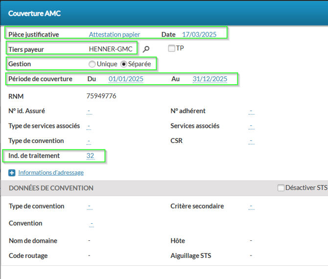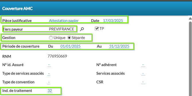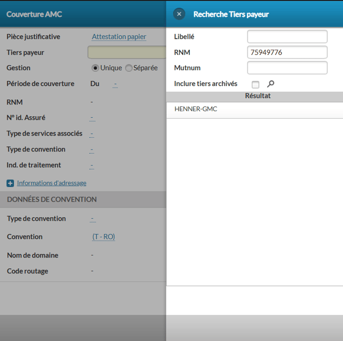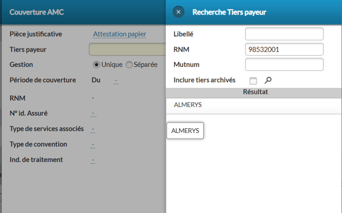 ==> Notez le numéro d'AMC visible sur l'attestation du patient dans le champ RNM (Registre National des Mutuelles).