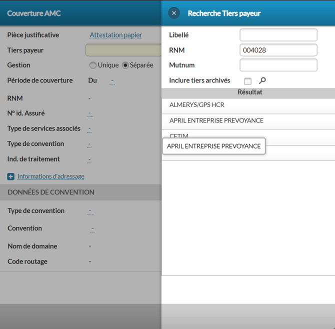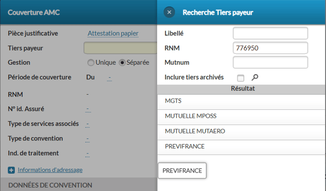 Tapez le numéro AMC puis cliquez sur la loupe. La liste des tiers s'affiche en dessous, sélectionnez la mutuelle en cliquant dessus. |