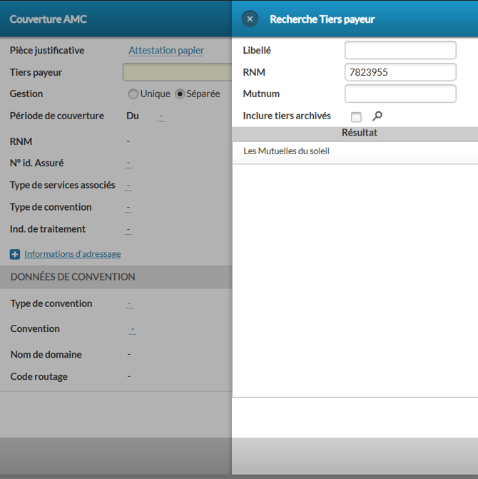 Sélectionnez le Tiers payeur correspondant à la mutuelle. , |
