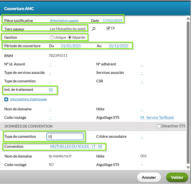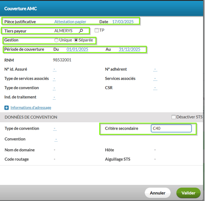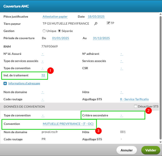 Le critère secondaire (CSR) (2) : si la mutuelle possède un critère secondaire, saisir la valeur, la convention sera automatiquement sélectionnée.