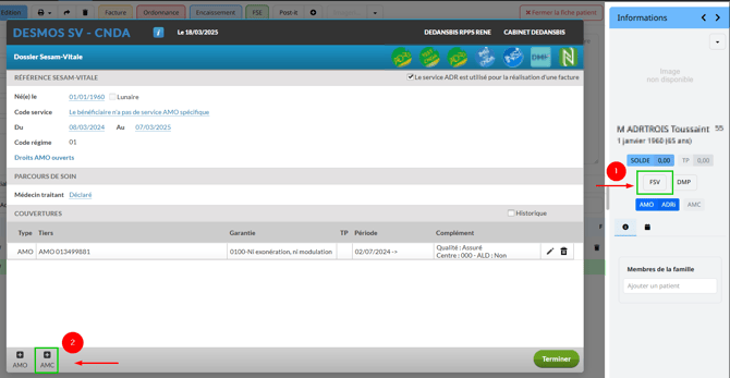 | Dans la fiche patient, l'icone AMO et AMC sont verte : La feuille de soins sera proposé en tiers payant AMO + AMC par défaut. | ![]() |