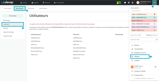 Il peut gérer les accès et restreindre certaines fonctionnalités aux autres utilisateurs (praticiens non ADMIN, assistantes). Il peut y avoir plusieurs comptes administrateurs au sein du logiciel Weclever.
